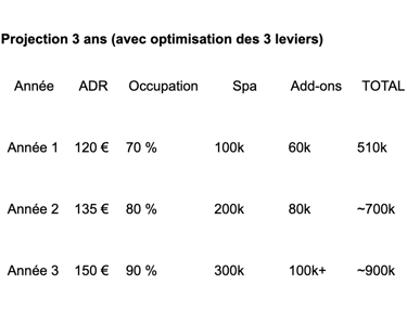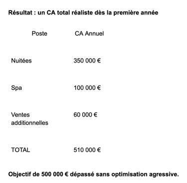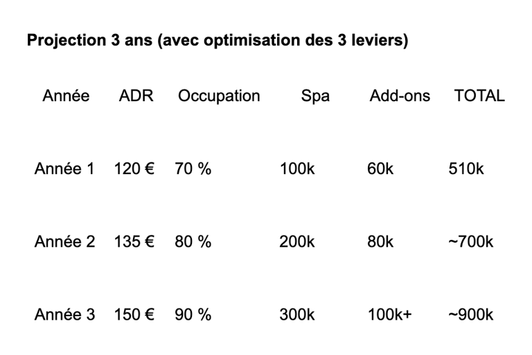 Ensuite, la feuille de route est simple : ajouter 100 000 € de chiffre d’affaires supplémentaire chaque année, pour que d’ici trois ans, votre spa puisse prétendre à un rythme de croisière d’au moins 300 000 € de revenus annuels.