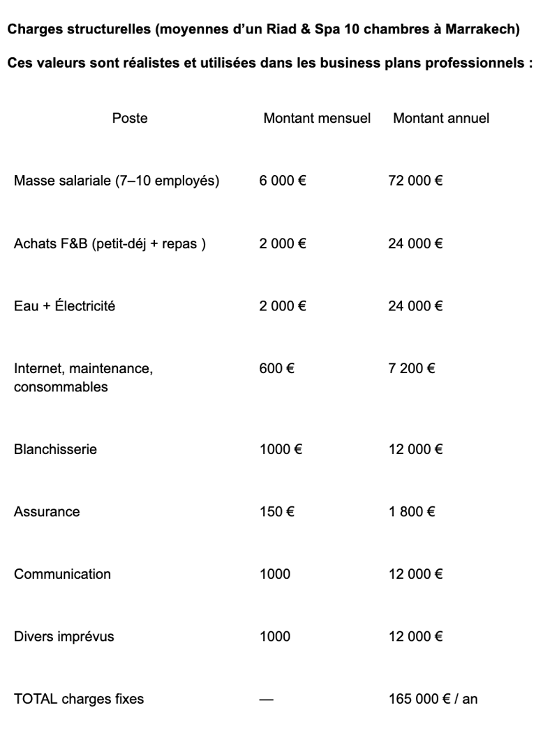 Un riad de 10 chambres, correctement exploité, peut générer entre 107 000 € et 254 000 € de bénéfice net par an avec 70 % de taux d’occupation, 120 € de prix moyen et un Spa n’exprimant encore que 35 % de son potentiel réel.