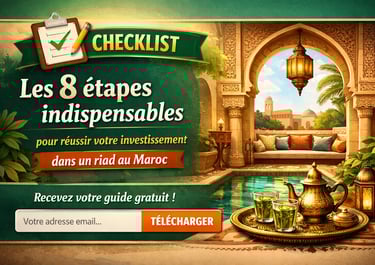 Télécharger la Checklist : Les 8 étapes indispensables pour réussir votre investissement dans un Riad + rejoignez notre Newsletter avec de nouvelles opportunités exclusives.