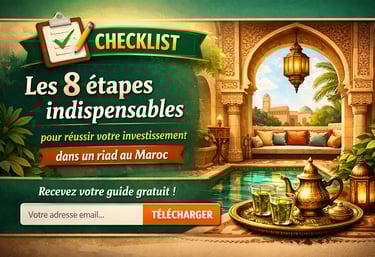 Télécharger la Checklist : Les 8 étapes indispensables pour réussir votre investissement dans un Riad + rejoignez notre Newsletter avec de nouvelles opportunités exclusives.